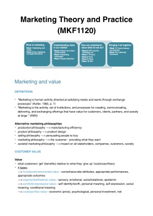 Detailed and extensive notes covering all topics from the entire semester. Topics include: - Marketing and Value - Key marketing Concepts and Terms - Macro and Micro Environments - Buyer Behaviour - Market Research - Segmentation, Targeting and Positioning - Product - Price - Place (distribution) - Promotion (IMC) - Current Issues in Marketing Practice - A Planning Framework