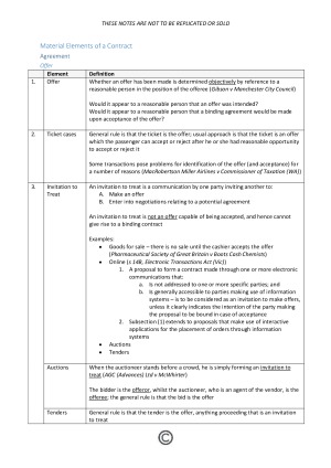 Notes include weeks 1-12 of LAW50002 examinable content. Notes include all readings and case authorities. Topics covered include: General Overview -What is a Contract? -Material Elements of a Contract -Matters Affecting Formation and Enforcement of Contracts -What is the Content and Terms of the Contract? -What do the Terms Means? -Types of Contracts Material Elements of a Contract -Agreement -Consideration -Intention -Certainty Matters Affecting Formation and Enforcement of Contracts -Formalities -Capacity -Privity -Estoppel What is the Content and Terms of the Contract? -Express Terms -Implied Terms -Consumer Contracts