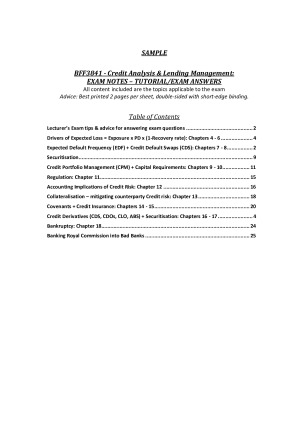 Scored an HD with 30 mins to spare on final exam only using these notes! Notes and answers are formatted so they are EASY TO UNDERSTAND AND MEMORISE. An array of PROVEN memorisation techniques are used throughout the notes' formatting. Includes ALL graphs and charts that you NEED to understand and memorise to replicate in the exam to show 100% understanding of material: - Loan-Loss distribution - Securitisation - Credit Default Swaps (CDS) - CLOs (synthetic balance sheet CDO) - Asset-backed security (ABS) + ABS CDO: This is THE MOST IMPORTANT GRAPH in the entire unit which many students fail to understand and replicate correctly - easy marks using these notes! (graphs/flow charts are the FASTEST and EASIEST way to show understanding of course content) Includes everything applicable to the final exam. The exam is based on content included in the answers to the questions. (See my HD mid-sem test answer template for mid-sem test content that is not in the exam) Covers chapters 4-18 of textbook Notes content: - Lecturer’s Exam tips & advice for answering exam questions - Drivers of Expected Loss = Exposure x PD x (1-Recovery rate): Chapters 4 - 6 - Expected Default Frequency (EDF) + Credit Default Swaps (CDS): Chapters 7 - 8 - Securitisation - Credit Portfolio Management (CPM) + Capital - Requirements: Chapters 9 - 10 - Regulation: Chapter 11 - Accounting Implications of Credit Risk: Chapter 12 - Collateralisation (5 criteria of collateral) – mitigating counterparty Credit risk: Chapter 13 - Covenants + Credit Insurance: Chapters 14 - 15 - Credit Derivatives (CDS, CDOs, CLO, ABS) + Securitisation: Chapters 16 - 17 - Bankruptcy: Chapter 18 - Banking Royal Commission into Bad Banks: ALL the lending and economic implications clearly laid out