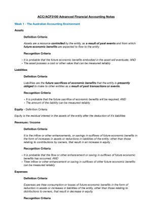 ACF3100 Advanced Financial Accounting Notes for the MID SEMESTER TEST Topics include: Week 1 - The Australian Accounting Environment Week 2 - Accounting Theories & Research Week 3 - Measurement: Fair Value Week 4 - Intangible Assets