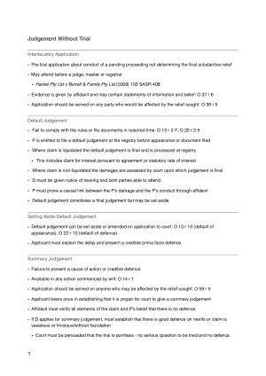 Civil Procedure Summary Notes Provides an overview on each weeks' contents including: - Discovery, Inspection and Privilege - Commencing an Action - Defending an Action - Judgment without Trial - Evidence and Trial - Costs - Enforcement - Appeal - Relevant Provisions Each overview includes relevant principles, law and authorities.