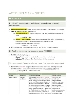 These are a set of comprehensive notes prepared for ACCT3563. Content sourced from both seminar slides and the prescribed text. I also added many example questions, case study and learning techniques for you to get understand quicker. These may prove useful in the each quizzes (C-PAT) and final exam. In addition, I have highlighted each points that C-PAT tested, will make you preparation much easier. These notes contain a summary of all examinable material: seminar 1 ~ 11 and relevant chapter in Reading Kit, including: -Analysing the external environment, -Analysing the internal environment, -Developing strategy, -Implementing strategy using strategic performance measurement system, -Managing the shareholder value, -Managing the customer value, -Managing the internal process - suppliers, social and environment, -Managing the learning and growth perspective - human capital and risk culture Was able to achieve a D grade with these notes, and I hope it will be the same for you too!