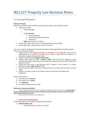 Concise and neatly presented notes with up-to-date content for MLL327 or any property law unit. Notes are fully paginated with colour highlights for cases, legislation, critical points and useful exam advice/sample answers. All unit topics covered as listed below: - Concept and categories of property - Possession and fixtures - Adverse possession - Doctrine of Tenure and Native Title - Native Title - Doctrine of Estates - Leases - Equitable interests - Easements - Restrictive covenants - Mortgages
