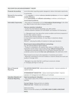 Covers all topics from weeks 1-12 including: - Objectives of financial reporting and information asymmetry - recognition and intangible assets - measurement - income and performance metrics and share market response - ratio analysis - earnings management - valuation - efficient markets - contracting - voluntary disclosure and regulation View style of the summary before your worth every dollar!