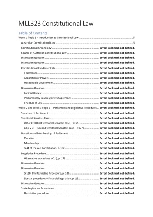 Comprehensive summarised notes for MLL323 Constitutional Law. Used in the exam and received a high distinction mark both in the exam and overall for this unit. These notes are summaries of the lectures, the weekly content and contain relevant discussion questions. Detailed and simple contents page to make looking for relevant cases and topics quicker in the exam. Notes also contain page number references to the text book.