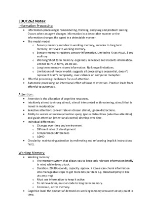 Simple and clear exam notes that cover topics in EDUC262. Topics covered: Information processing Attention Working memory Long term memory Encoding Retrieval Metacognition Mindsets Emotional development Motivation Mental health The self Understanding others Self regulation Educational myths