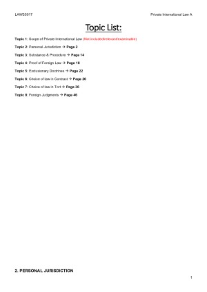 Topic 1: Scope of Private International Law (Not included/relevant/examinable) Topic 2: Personal Jurisdiction Page 2 Topic 3: Substance & Procedure Page 14 Topic 4: Proof of Foreign Law Page 18 Topic 5: Exclusionary Doctrines Page 22 Topic 6: Choice of law in Contract Page 26 Topic 7: Choice of law in Tort Page 36 Topic 8: Foreign Judgments Page 46