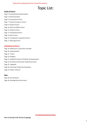 Heads of Power: Page 2: Constitutional Interpretation Page 3: Characterisation Page 5: Corporations Power Page 7: Trade & Commerce Power Page 8: Taxation Power Page 10: External Affairs Power Page 12: Defence Power Page 13: Nationhood Power Page 14: Race Power Page 15: Compulsory Acquisition Power Page 17: Marriage Power Limitations on Power: Page 18: Melbourne Corporation Principle Page 20: Appropriation Page 21: Grants Page 22: Religion Page 23: Implied Freedom of Political Communication Page 24: Freedom of Interstate Trade/Intercourse Page 25: Cigamatic Page 26: Interstate People Discrimination Page 27: Duties of Excise Misc: Page 28: Inconsistency Page 30: Reading Down/Severance
