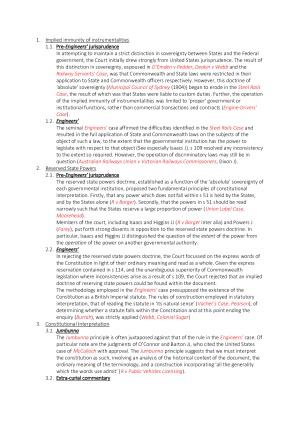 These are the notes I used for the final Federal Constitutional Law exam (Sem 1 2018). I received an overall mark of 90 in the course. They are prepared for easy use in an exam situation: by selecting the correct issue, you can work methodically through the relevant jurisprudence and apply it to the facts. The notes are written to allow quick reference to key cases, but also includes relevant details (such as important dissents etc) which may be used for tricky questions or essay responses. The notes were written by summarizing all set readings and online materials, as well as doing additional readings on some of the key cases. The sub-headings should make it particularly easy to use during an exam. These notes served me extremely well: I hope they help you too! These notes include: - Implied immunity of instrumentalities - Reserved state powers - Constitutional interpretation - Characterisation - s 51 powers - External affairs power - Races power - Taxation powers (ss 51(ii), 53, 55) - Grants power - Defence power - Inconsistency of laws - The Melbourne Corporation Principle - Freedom of interstate trade and commerce - Trial by jury - Freedom of religion - Freedom of political communication - Detention (Immigration, Kable etc)