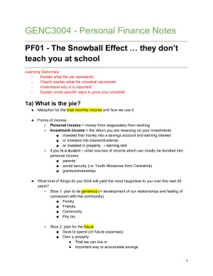 These notes summarise and synthesise the 14 Personal Finance units which are explored in UNSW's GENC3004 summer online course (Duration of 4 weeks). The content is the exact same for Trimesters 1, 2 and 3. The topics covered are: 1. The Snowball Effect 2. Mastering Money 3. Money and Happiness 4. Dreaming Big 5. Money Intelligence 6. Valuable Brains 7. Securing Jobs 8. First Home 9. Home Loans 10. Defending your Snowball 11. Tax Mistakes 12. Financial Independence 13. Investment Mistakes 14. Snowballing Strategy * Questions for each unit are collaborated and answered at the end of each chapter in the notes. * Having a complete set of notes is very useful for the three quizzes that are assessed and for your financial plan which you need to refer back to key concepts addressed in the lectures.