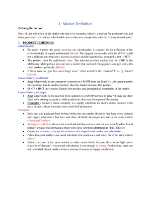 Exam Cheat sheet for Competition Law covering the following topics: 1. Market Definition 2. Market Power 3. Cartel 4. Misuse of Market Power The notes provides a structure on how to answer exam questions