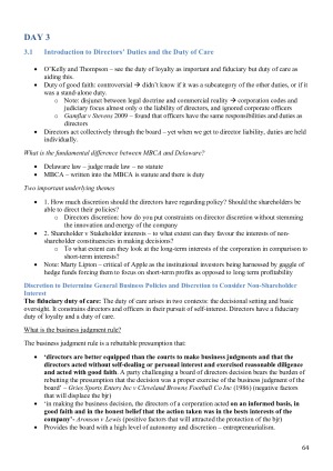 This is complete set of detailed case summaries and relevant legislation for US Corps law. You won't need to touch the book as long as you have this set of notes. Day 1: …………………………………………………………………………………………………………………. Page 2 • How are corporations regulated in the US?............................................................. Page 2 • The Corporation v Alternate Business Forms…………………………………………… Page 8 • The Corporate Entity, when can it be pierced? ………………………………………… Page 12 Day 2: ………………………………………………………………………………………………………………… Page 20 • The Corporate Form and the Role & Rights of Shareholders…………………… Page 20 • Corporate Constitutions …………………………………………………………………………. Page 24 • Allocation of Powers Between Shareholders, Directors and Officers………. Page 29 • Voting Rights…………………………………………………………………………………………… Page 35 • Staggered Boards…………………………………………………………………………………….. Page 50 • The Annual Meeting and Other Forums for Shareholder Action……………… Page 50 • Removal of Directors from Office ……………………………………………………………. Page 51 • Voting by Proxy and Regulation of Proxy Solicitation …………………………….. Page 53 • Shareholder Proposals…………………………………………………………………………….. Page 54 • Shareholder Access to Corporate Records and Shareholder Lists…………….. Page 56 • The Dodd-Frank Acts 2010 Corporate Governance Reforms ……………………. Page 58 • Closely Held Corporations………………………………………………………………………… Page 58 Day 3: ……………………………………………………………………………………………………………….… Page 64 • Duty of Care …………………………………………………………………………………………….. Page 64 • Business Judgment Rule…………………………………………………………………………… Page 68 • Duty of Care intersection with duty of loyalty and duty of good faith……….. Page 73 • Limiting and Eliminating Liability…………………………………………………………….. Page 76 Day 4: …………………………………………………………………………………………………………………. Page 79 • Duty of Loyalty…………………………………………………………………………………………. Page 79 • Conflicting Interest Transactions ……………………………………………………………. Page 83 • Duty of Controlling Shareholders ……………………………………………………………. Page 84 • Derivative Suits . ……………………………………………………………………………………… Page 84 • Hostile Takeover and Takeover Defences under US Law………………………….. Page 89