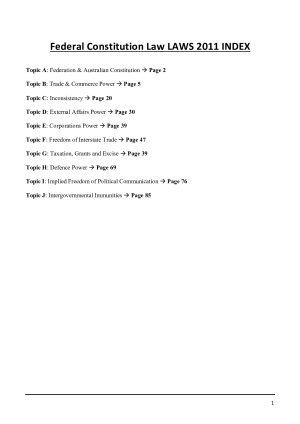 Detailed notes of every case in the LLB stream (including legislation) Topic A: Federation & Australian Constitution Page 2 Topic B: Trade & Commerce Power Page 5 Topic C: Inconsistency Page 20 Topic D: External Affairs Power Page 30 Topic E: Corporations Power Page 39 Topic F: Freedom of Interstate Trade Page 47 Topic G: Taxation, Grants and Excise Page 39 Topic H: Defence Power Page 69 Topic I: Implied Freedom of Political Communication Page 76 Topic J: Intergovernmental Immunities Page 85