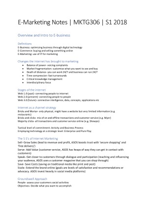 Highlights of each week's lectures Notes from tutorial Notes from MailChimp demonstration Topic List: - Overview and Into to E-business - Strategic E-marketing Planning & E-business Models - E-marketing environments - Understanding E-consumers - Online Value Creation - Customer Acquisition and Management - Pricing - Distribution