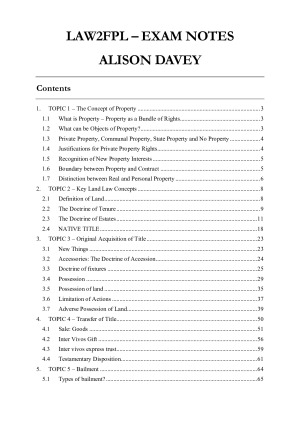 Topics covered: TOPIC 1 - The concept of property TOPIC 2 - Key Land Law Concepts TOPIC 3 - Original Acquisition of Title TOPIC 4 - Transfer of Title TOPIC 5 - Bailment