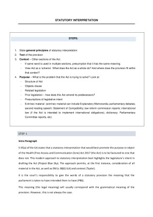 Notes are structured in a step-by step exam answer format with excellent intro sentences and paragraph structures. Includes case authorities. 1. Introduction and general principles 2. Text analysis and semantic construction 3. Context analysis 4. Purpose analysis, including presumptions and principle of legality 5. Extrinsic Materials 6. Policy issue: Principle of Legality