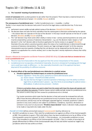 These notes are a combination of casebook notes, notes from the tutor, textbook and further readings. They include all 13 topics in line with the University of Sydney Unit of Study outline. With 80 pages of notes, each case is summaries in detail, listing the judges and pinpoint references as well as some dissenting reasonings where applicable. The topics include: Introduction to administrative law Merits Review Judicial Review: Jurisdiction of courts Access to judicial review - Standing Judicial review of rule-making Procedural Fairness Considerations, Purposes, Policies and Representation Unreasonableness and Uncertainty Errors of Law and Fact Jurisdictional Error Remedies