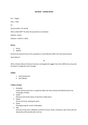 Notes that cover all the lecture content, tutorial information and the recommended textbook for the unit "Anthropology of Islam" written by G. Marranci, 2008. Easy to read, understand and memorise. Notes that will be a good purchase and bring you an easy pass. Topic List: Topic One: Introduction to Anthropology of Islam Topic Two: Islam, history and rituals Topic Three: From studying Islam to studying Muslims Topic Four: Studying Muslim in the west before and after September 11 Topic Five: From the exotic to the familiar: Anamneses of field among Muslims Topic Six: Beyond the stereotype: Challanges in understanding Muslim Identities Topic Seven: The Ummah Paradox Topic Eight: Dynamics of Gender in Islam Topic Nine/Ten: Discussing Islamic fundamentalism Topic Eleven: Youth, identity and radicalisation - An anthropological study and interpretation