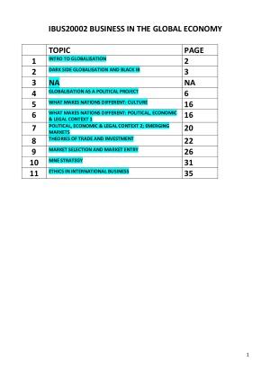 IBUS20002 BUSINESS IN THE GLOBAL ECONOMY TOPIC PAGE 1 INTRO TO GLOBALISATION 1 2 DARK SIDE GLOBALISATION AND BLACK IB 2 3 Not Included 4 GLOBALISATION AS A POLITICAL PROJECT 5 5 WHAT MAKES NATIONS DIFFERENT: CULTURE 15 6 WHAT MAKES NATIONS DIFFERENT: POLITICAL, ECONOMIC & LEGAL CONTEXT 1 15 7 POLITICAL, ECONOMIC & LEGAL CONTEXT 2; EMERGING MARKETS 19 8 THEORIES OF TRADE AND INVESTMENT 21 9 MARKET SELECTION AND MARKET ENTRY 25 10 MNE STRATEGY 30 11 ETHICS IN INTERNATIONAL BUSINESS 34