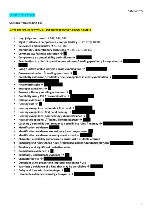 I used these notes to receive an overall mark of 83 (Distinction) in CPEP. These notes have been comprehensively put together in a template format based on the new curriculum of CPEP. My notes are all COLOUR CODED and NEATLY ORGANISED into different subsections, tables and headings. They also have MINI-PRACTISE QUESTIONS, DIAGRAMS and PICTURES integrated into the notes. There is a strong emphasis on credibility in these notes, which is a major topic area examined in the new CPEP course. I have also developed PATHWAYS for each topic area in the course in the form of MIND-MAPS. As you will learn, pathways are an incredibly useful tool in CPEP to help understand the often confusing Evidence Act. However, once these pathways have been developed, the Evidence Act becomes a whole lot easier to apply. In these notes, I've scaffolded a template that can be used in both the mid-sem and final exam problem question. The scaffold contains the issues, rule (law) and then possible ways to apply the law (ie. applying the facts of the case). I have included blank spaces where it is appropriate to apply the facts. See sample for contents page, noting that the section numbers are un-redacted in the full notes for your convenience. I hope these notes will be as useful to you as they were for me in CPEP. Having notes COLOUR CODED and NEATLY ORGANISED was a real asset in a time pressured exam.