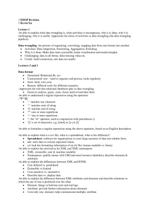 This Note for Elements of Data Processing is used for revision purposes. It contains all lecture+tutorial topics from week 1 to week 12. Topics include: Data wrangling, Data format, XML/JSON, data pre-processing and data cleaning, Outliers, Recommender systems, Visualisation, Agglomerative, Correlations, Classification and regression techniques ( entropy, Decision Tree etc), record (data) linkage problem, Bloom filter, motivation for blockchain technology, 3 party protocol for privacy, k-anonymity and l-diversity, ethical considerations, big data summary and many more! The notes is quite compact, with few spaces. It covers all examinable materials including lectures and workshops. I used this note to get 92% in final exam. There are 12 pages with 5000+ words of detailed summary and key points to study for. Spending a week on it to get Easy H1 :)
