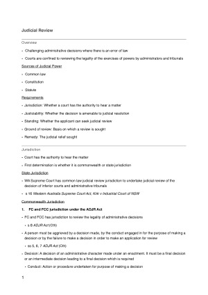 Administrative Law Summary Notes Provides an overview on each weeks' contents including: - Fundamentals - Merits Review (Commonwealth or State jurisdiction, internal vs external review, jurisdiction, standing, powers, procedural matters) - Freedom of Information (jurisdiction, application requirements, exceptions, exemptions, review) - Ombudsman (jurisdiction, powers, outcome) - Judicial Review (jurisdiction, justiciability, standing, grounds of review, procedural fairness, remedies) Each overview includes relevant principles, law and authorities.