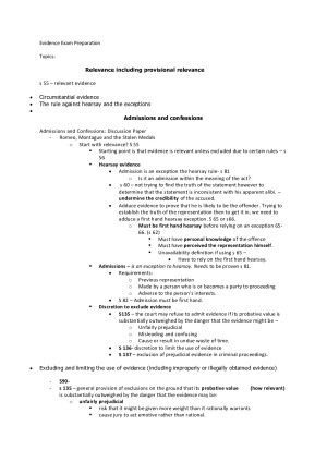 These notes are set out and categorised nicely: - Relevance - Hearsay - Admissions -Confessions -Excluding Evidence -s 135-139 - s 90 - s 101 - Coincidence and Tendency