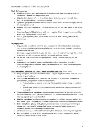 Notes organised by week with lecture notes, online modules, assigned readings and ER in the news articles. I have made these detailed notes using all assessable content for the course - online modules, lecture slides, lecturer comments and examples, required readings of journal articles and news articles, and the textbook. ALL the important information for WORK1003 to help you get a great mark for tutorial participation, the mid-semester exam and the final exam. Topics in my notes are according to the week they were taught 1. Introduction to employment relations 2. Employment relations and the changing context 3. Employment relations theories and workplace conflict 4. Writing critical essays 5. The State 6. Employers and employee associations 7. Employees and unions 8. Reading week (no lectures) 9. The regulatory framework 10. Recruitment and selection 11. Pay and reward 12. Performance management 13. Conclusion Notes for the required readings are also included in these notes: Week 1 Findlay & Thompson (2017) - Contemporary work: Its meanings and demands Week 2 Textbook chapter 1 - What is employment relations? Arnold (2017) - The new black: The overworked, underpaid, cash-in-hand worker is becoming increasingly common Week 3 Textbook chapter 2 - The study of employment relations: analytical tools (pg. 33-39 only) Textbook chapter 3 - The study of employment relations: values Bray (2018) - Workplace cooperation and the potential for mutual gains Week 4 Textbook chapter 12 - Industrial conflict Pauk (1969) - The research paper: time and technique Week 5 Textbook chapter 4 - The state Wright & Lansbury (2016) - Employment relations in Australia Week 6 Textbook chapter 5 - Management and employer representatives Barry & You (2018) - Employer and employer association matters in Australia in 2017 Week 7 Textbook chapter 6 - Employee representation: unions Gahan et al. (2018) - Unions and collective bargaining in Australia in 2017 Week 8 - no readings Week 9 Textbook chapter 8 - State regulation: Minimum awards and standards Textbook chapter 9 - State regulation: EEO, unfair dismissal and safety at work (pg. 320-334 only) Week 10 Nankervis et al. (2014) - Chapter 6: Talent attraction and selection Warhurst et al. (2009) - Lookism: The new frontier of employment discrimination Week 11 Long & Shields (2005) - Performance pay in Canadian and Australian firms: A comparative study (pg. 1783-90, 1804-07 only) Prowse & Fells (2017) - The living wage: Policy and practice Week 12 Nankervis et al. (2014) - Chapter 8: Management and performance Rosenblat (2018) - Chapter 5: Behind the curtain: How Uber manages drivers with algorithms Week 13 Godard (2014) - The psychologisation of employment relations Goods et al. (2019) - Is your gig any good? + ER in the news articles (useful for final exam and tutorial discussions)