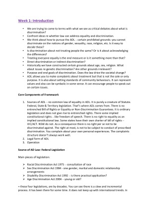 Includes: - lecture notes - readings - tutorial questions/discussions Very easy to read and follow. Topics include: 1. Introduction 2. Equality Theory 3. Direct Discrimination 4. Indirect Discrimination 5. Sex Discrimination 6. Disability Discrimination Act 7. Disability Discrimination and Age Discrimination 8. Racial Discrimination 9. Sex Discrimination 10. Harassment 11. Vilification 12. Procedure and Remedies