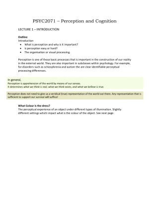 Concise, clear and detailed lecture notes (including online and face to face lectures). Contains all lecture topics including: - First steps in vision; - Cortical visual processing; - Object perception; - Colour perception; - Space perception; - Motion perception; - Visual-vestibular perception; - Scene perception; - Cognitive psychology; - Attention; - Categorisation & reasoning; - Semantic memory; - Propositions and scripts; - Lexical memory and Working memory; - Long-term episodic memory. Hope these help!