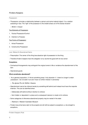 Property Law A Summary Notes Provides an overview on each weeks' contents including: - Fixtures - Finders Keepers - Adverse Possession - Equitable Interests - Formalities - Priorities Disputes - Co-Ownership Each overview includes relevant principles, law and authorities.
