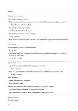 Property Law B Summary Notes Provides an overview on each weeks' contents including: - TLA Key Elements - Fraud - Equitable Interests - Leases - Lease Covenants - Mortgages - Mortgagee's Rights & Remedies - Easements Each overview includes relevant principles, law and authorities.