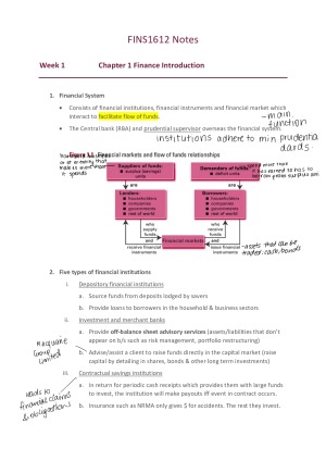 These detailed typed notes cover the course content from Weeks 1 - 6. The contents are from lectures, textbook and tutorials all gathered in one! It includes images with clearly handwritten annotations (from iPad Pro) for in depth explanations. These notes are broken down for you weekly as seen below: CH1 – A Modern Financial System: An Overview CH02 – Commercial Banks CH04 – The Stock Exchange & The Corporation CH05 – Corporations Issuing Equity in the Share Market CH06 – Investors in the Share Market CH07 – Forecasting Share Price Movements CH09 – Short-Term Debt CH10 – Medium-to-Long-Term Debt