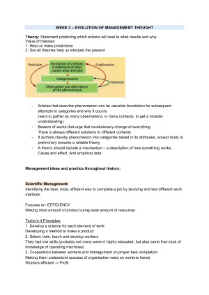 These notes are VERY comprehensive and contain material and information from both lectures and the prescribed textbook for this unit. The notes covered the examinable content: - Management Today - History of Management (Classical Approaches, Behavioural Approach, Quantitative Approaches, Modern Approaches) - Authority and Influence - Managing In and Beyond Corporations (Environmental aspects of management) - Four Functions of Management (Planning, Organising, Leading, Controlling) - Decision Making - Motivation - Managing for Social Inclusion - Managing Diversity These notes helped me get an easy HD, and memorise all the content required for the exam! These notes are definitely a great supplementary guide in addition to lectures and tutorial exercises which will definitely improve your understanding of MGC1010 :)
