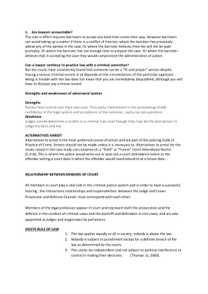 info on : -adversarial system - dicey ruke of law - court systems - relationship between members of court -alternatives to arrest and many more