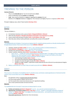 Torts notes with topic sentences and colour coded for easy exam use. Two different textbooks used for note compilation. Topics covered: - Trespass to the person: battery, assault, false imprisonment - Defences to trespass to person - Trespass to land, private nuisance and defences and remedies Negligence: - Duty of Care - Pure Economic Loss - Pure Mental Harm - Breach of Duty - Causation - Remoteness - Defences to negligence (contributory negligence, volenti, plaintiff illegality, good Samaritan, limitation of action) - Remedies - Vicarious liability -