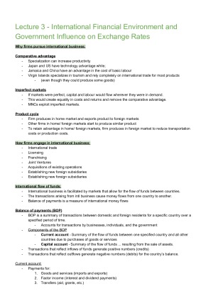 - Detailed notes - Colour coded examples and case studies - Calculation examples - Topics include: 1. Introduction and MNC's 2. Foreign Exchange Markets 3. International Financial Environment and Government Influence on Exchange Rates 4. Currency Derivatives 5. International Arbitrage and Interest Rate Parity 6. Parity relationships and forecasting exchange rates. 7. Measuring exposure to exchange rate fluctuations 8. Managing Risk Exposure and Foreign Investments 9. MNC Capital Budgeting and Country RIsk 10. Long and short term Financing