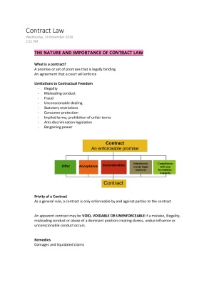Entire Contract Law Topics Covered Including: -Terms of a Contract -Exclusion Clauses -Misleading or Deceptive Conduct -Mistake -Duress -Undue Influence -Unconscionable Conduct -Unfair Terms -Performance (Termination by performance) -Termination by Agreement -Termination for Breach - Termination by Frustration - Damages & Liquidated Claims - Equitable Remedies Lexis Nexis Textbook Includes textbook diagrams, answer shortcuts and notes from lectures and tutorials.
