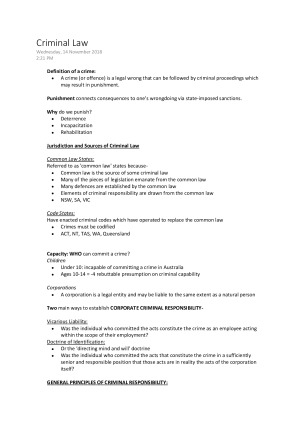 Criminal Law in the Common Law Jurisdiction All topics covered, including slides from lectures as well as helpful statutory links to answer questions. Topics: - Homicide - Murder -Involuntary Manslaughter -Assault -Sexual Offences -Theft -Obtaining property/ Financial Advantage by Deception -Strict Liability offences -Property Offences -Inchoate Offences -Participatory Liability -Defences to crime