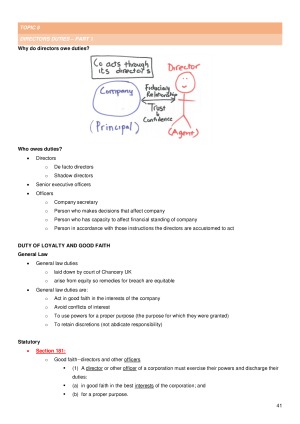 Extensive summary notes highly useful for the open book exam. Topics include: - Basic legal concepts - Characteristics of the company - Business structures - Types of companies - Constituting companies - Director's Duties and consequences of breach - Shareholders remedies - Share Capital and Dividends - Insolvency - Debt and equity financing - Relations with outsiders - Liquidation Includes relevant court cases, diagrams and examples.