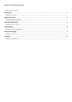 The main concepts and lecture questions for Modules; Cognitive Processes, Neuroscience, Learning and Motivation, Mental Abilities, Abnormal Psychology and Perception. Theses notes are incredibly useful for summarising overall course content and ( exam material) as they definitely helped me