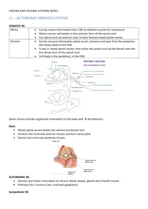 These notes comprehensively cover all content covered in lectures and practicals in Viscera and Visceral Systems. These notes go into detail for particularly difficult topics and those topics which are often assessed. These notes are perfect for studying for the MSTs or the exam. These notes cover: - autonomic nervous system - thorax, lungs and breathing - mediastinum and the heart - abdomen and GIT - pelvis and reproductive organs - skull, brain and cranial nerves - ear - nose - larynx - eye