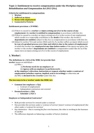 These highly detailed notes were all I needed to achieve a HD for MLL315 Personal Injuries Compensation Scheme in T3 2018. Cases are highlighted and legislation is bolded. Also includes diagrams and tables. I work for Shine Lawyers and have revised these notes accordingly. These notes are ready to print out to use during the semester and exam. Topics covered: 1. Introduction to Workplace Injury & Rehabilitation and Compensation Act (WIRC) 2. Introduction to Transport Accident Act (TA) 3. Alternative Dispute Resolution in WIRC & TA Act 4. Entitlement under WIRC Act 5. Types of Compensation Payments under WIRC Act 6. Common Law (Serious Injury Applications) under WIRC Act 7. Entitlement under TA Act 8. Types of Compensation Payments under TA Act 9. Common Law (Serious Injury Applications) under TA Act 10. Interactions between WIRC Act and TA Act and Other Acts