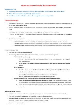 Notes for International Banking and Finance (BFF3331) monash completed in 2019. Notes from lectures and tutorials from week 8-11 (third set of 3 as can only upload notes of 10mb - please purchase set 1 & 2 for notes for the entire subject). Very detailed with added tutorial notes throughout. Learning objectives all covered and stated: 8: balance of payments and country risk 9: trade, payments, financing and countertrade 10: ethical banking, ESG and AML 11: future issues in international banking and finance