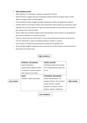 For the short answer and essay exam guide. Topics: attachment styles, IPV, affect regulation, typologies of violence, transference, counter-transference, perpetrator programs (3), risk assessment, vicarious traumatisation, the impact of domestic violence on children.