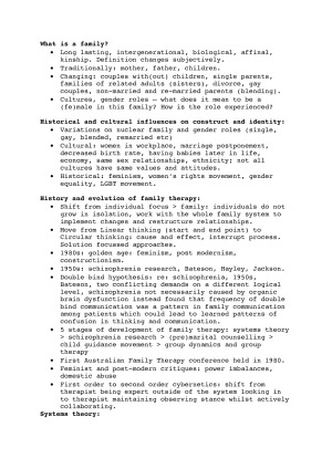 - key terms, figures and definitions - tips for exam - history and evolution of family - systems theory -cybernetics - life cycle stages - transgenerational approach - genograms - bowenian/natural systems theory - structural family therapy - milan systemic therapy - narrative therapy - psychodynamics and attachment - integration - ethics