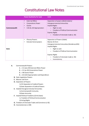 HD Constitutional law notes with precise and helpful topic sentences for each topic. Includes mini-case summaries to easily analogise in exam, mind-maps of concepts, colour coded for easy reading during exams. Topics include: A. Commonwealth Powers 1. s 51 (xxix 29) External Affairs Power 2. s 51 (xx 20) Corporations Power 3. s 96 Grants Power 4. s 81 & 83 Appropriation and Expenditure B. State Legislative Powers C. Manner and Form D. Separation of Powers 1. Cth Separation of Judicial Powers 2. State Separation of Judicial Powers E. Implied Intergovernmental Immunities 1. Commonwealth immunity 2. State Immunity F. Implied Political Freedoms (Cth & State) 1. Freedom of Political Communication 2. Voting Rights G. Freedom of Interstate Trade and Commerce (s 92) H. Inconsistencies (s 109)