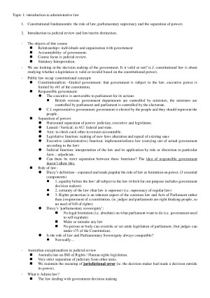 Taught by Andrew Grant Topic 1: Introduction Topic 2: Merits review Topic 3: Judicial review – jurisdiction of the courts Topic 4: Access to judicial review - standing Topic 5: Judicial review of rule-making Topic 6: Procedural fairness: Implication Topic 6: Procedural fairness: Content of the hearing rule Topic 6: Procedural fairness: The rule against bias Topic 7: Considerations, purposes, policies and representations Topic 8: Unreasonableness and uncertainty Topic 9: Errors of law and fact Topic 10: Jurisdictional errors Topic 11: Judicial review remedies Topic 12: Case study - breach of statutory duty to give reasons Topic 13: Restricting judicial review – privative clauses