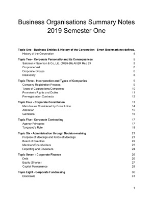 Summary notes from Business Organisations Semester One 2019 (the first semester under the new format of this unit). Please note that related party transactions and Week Twelve - "Process for receivership, schemes of arrangements, voluntary administration and winding up" are not included in these notes as they were not included in the final exam for Semester One 2019.