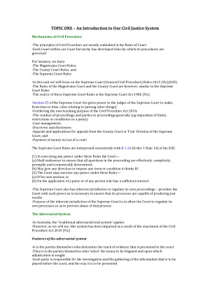 This unit is one of the largest law units that you will complete at Deakin. It is made up of 14 topics! That means that some weeks you will be learning two topics in the one week. These notes will take the pressure off as they are a complete summary of the entire course with included legislation and case law. Due to the exam being a hurdle requirement, extra care has been taken to ensure that the notes are clear and accurate. Topics include: 1. Introduction 2. The Victorian Court Hierarchy 3. Commencement of Proceedings 4. Service of Process 5. Appearance 6. Joinder of Claims and Parties 7. Pleadings 8. Summary Disposition 9. Amendment 10. Discovery 11. Costs 12. The Trial 13. Enforcement 14. Alternative Dispute Resolution